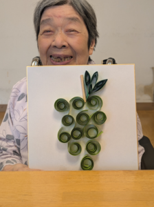 「どうやって作るんだろう?」と、皆様は興味津々。鉛筆を使って細い紙をくるくると丸め、ぶどうの粒を作っていきます。最初は真っ白だった色紙が、一つ、また一つと粒が貼られていくたびに、だんだんと本物そっくりのぶどうの房に。最後に葉っぱをつけて完成です!