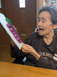 ご自身の手で完成させたぶどうを手に取ると、「こんなに上手にできたよ!」と言わんばかりの満面の笑みを見せてくださいました。