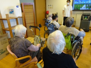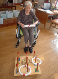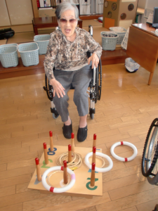 さくら町1・2丁目ではこの日、輪投げ大会を行いました。それぞれ輪っかを持っていただき、「せーのっ!」の合図で投げてもらいました。上手に得点されると「やった!」と喜んでおられ、他の皆様からは拍手が巻き起こりました。職員も一緒に参加し、とても楽しいひと時になりました。バックミュージックに運動会の音楽を流したので、気持ちは「秋の運動会」という感じになりました。