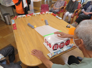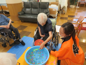 デイサービスでは、8月末に夏祭りを行いました。朝から天井にある提灯を見て「今日は何があるの?」と楽しみにしているご利用者もみえました。 金魚すくいと玉転がしを行い、花火の映像を見ながらお好み焼きとパフェを食べていただきました。「昔、お祭りであったけどやったことないわ~」と金魚すくいを初めてやられるご利用者もみえました。スピード勝負で何匹も一気につかまえる方、ゆっくり慎重につかまえる方、ポイが破れても周りの枠を使ってうまく捕まえる方などそれぞれのやり方で楽しんでみえました。
